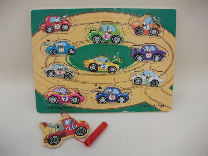 This magnetic wooden puzzle game features fun, automotive artwork and can also act as an introduction to counting. The magnetic truck can be used to “tow” the ten numbered cars from the game board followed by the challenge of returning the cars to their correct spots! A creative way to encourage hand-eye and fine motor development.